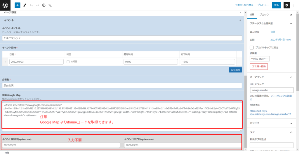 表示する場合は、埋め込み用のiframeコードをセットしてください。(PC) Google Mapで取得できます。